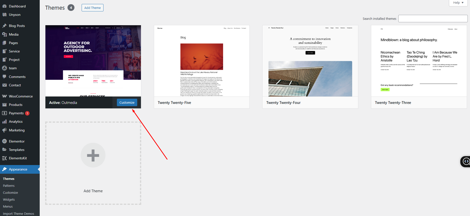 Once uploaded, activate the theme by heading to the “Themes” menu in the WordPress Dashboard. Locate the Outmedia Theme and hit “Activate”.