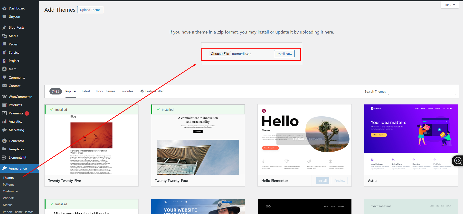 Note: When uploading your theme with the installer, please ensure you are uploading the theme .zip file, not the entire package you downloaded. In this case, you will be uploading Outmedia.zip