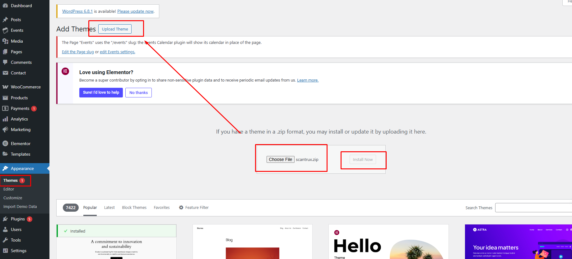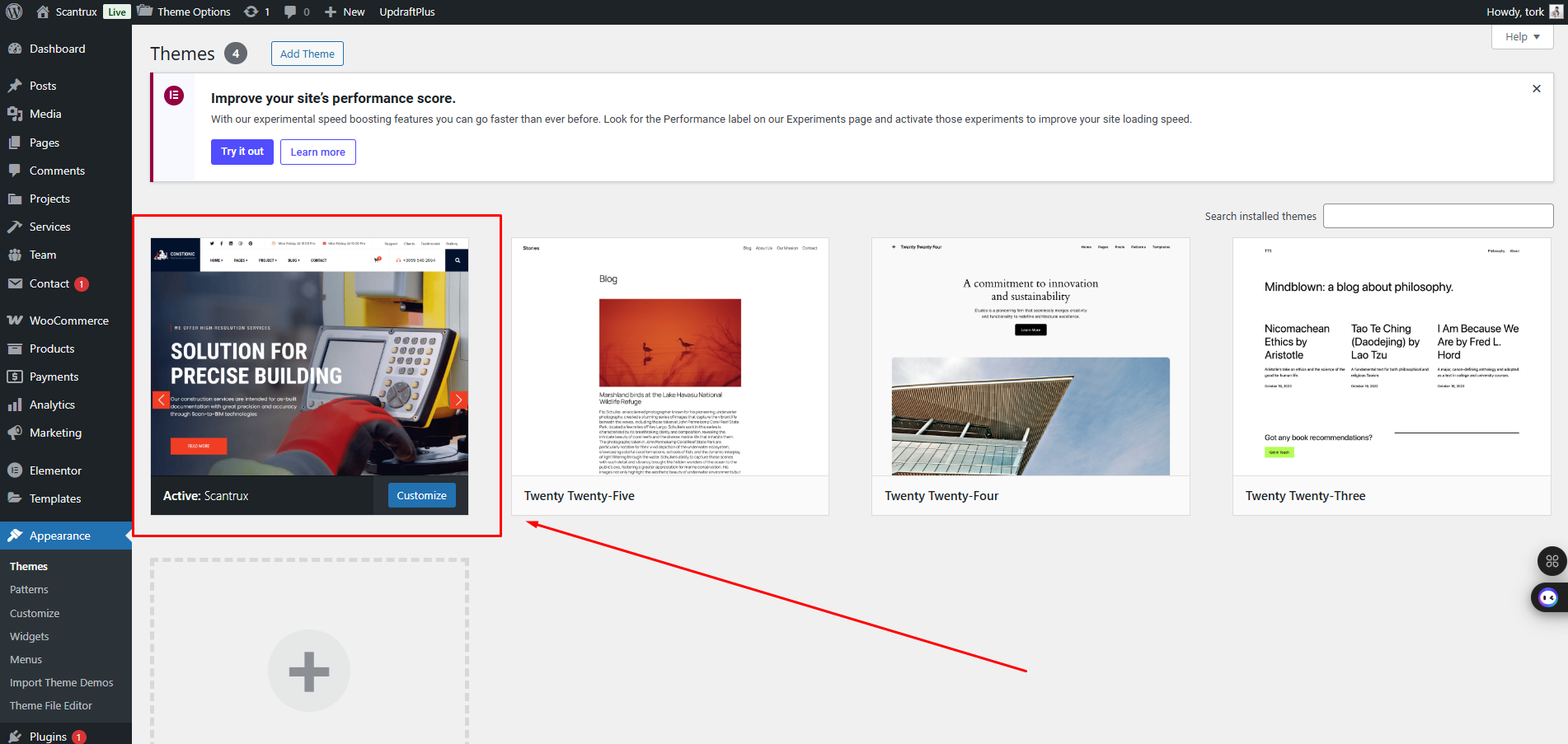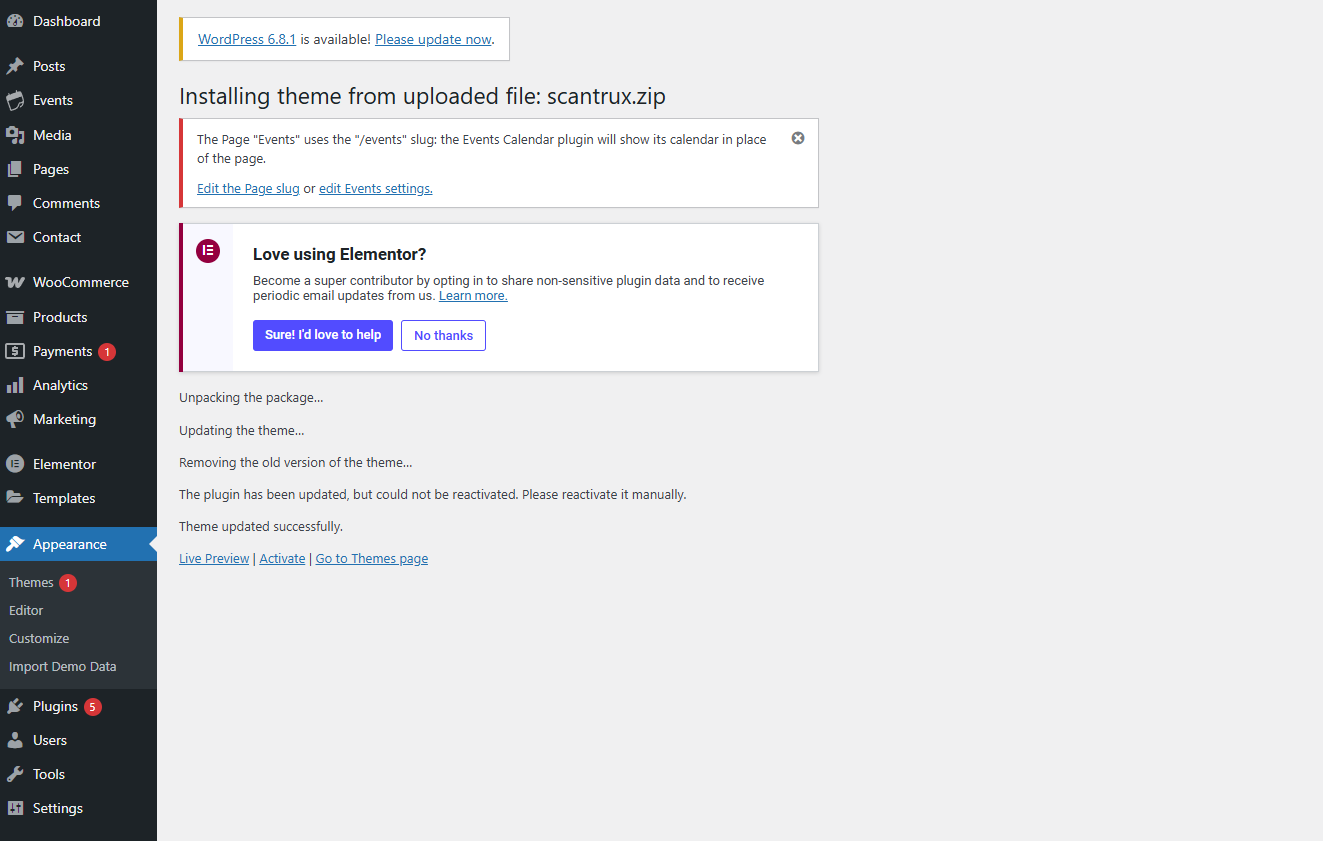 Once uploaded, activate the theme by heading to the “Themes” menu in the WordPress Dashboard. Locate the Scantrux Theme and hit “Activate”.