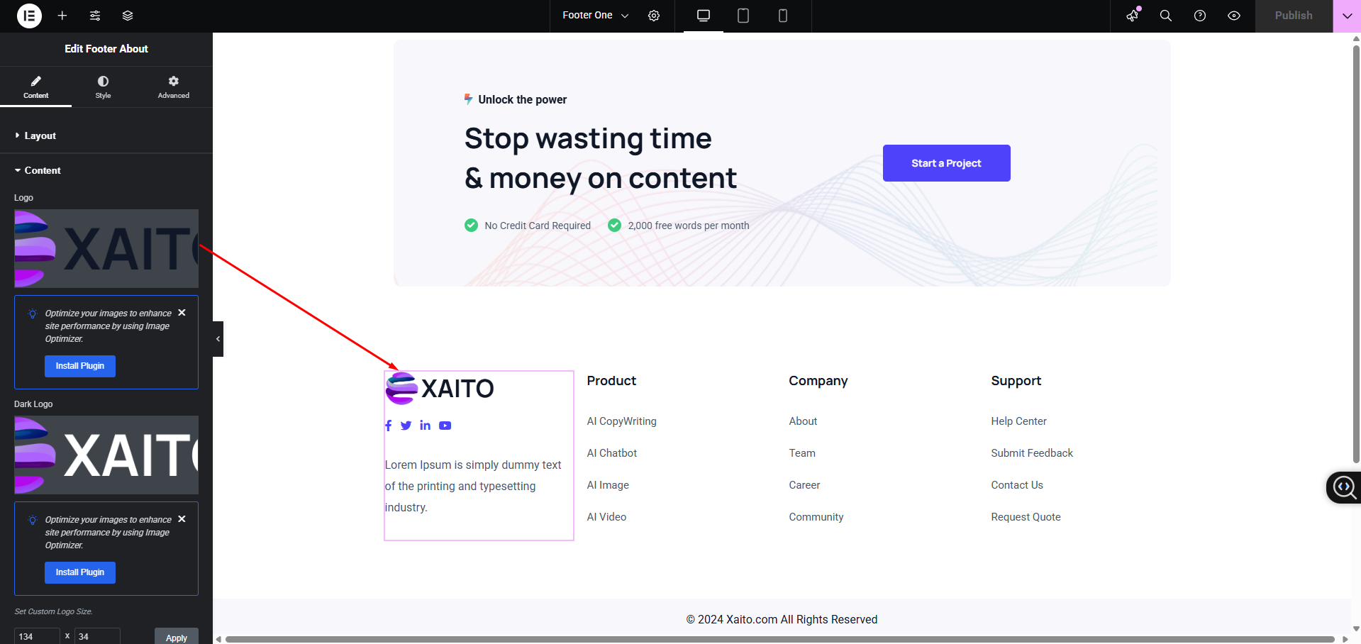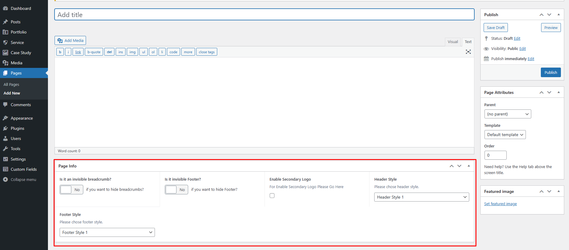 On each page you'll see a Template Settings metabox, located below the page content editor. This metabox includes various options to control the header style , footer visibility and Logo Setting on each page.